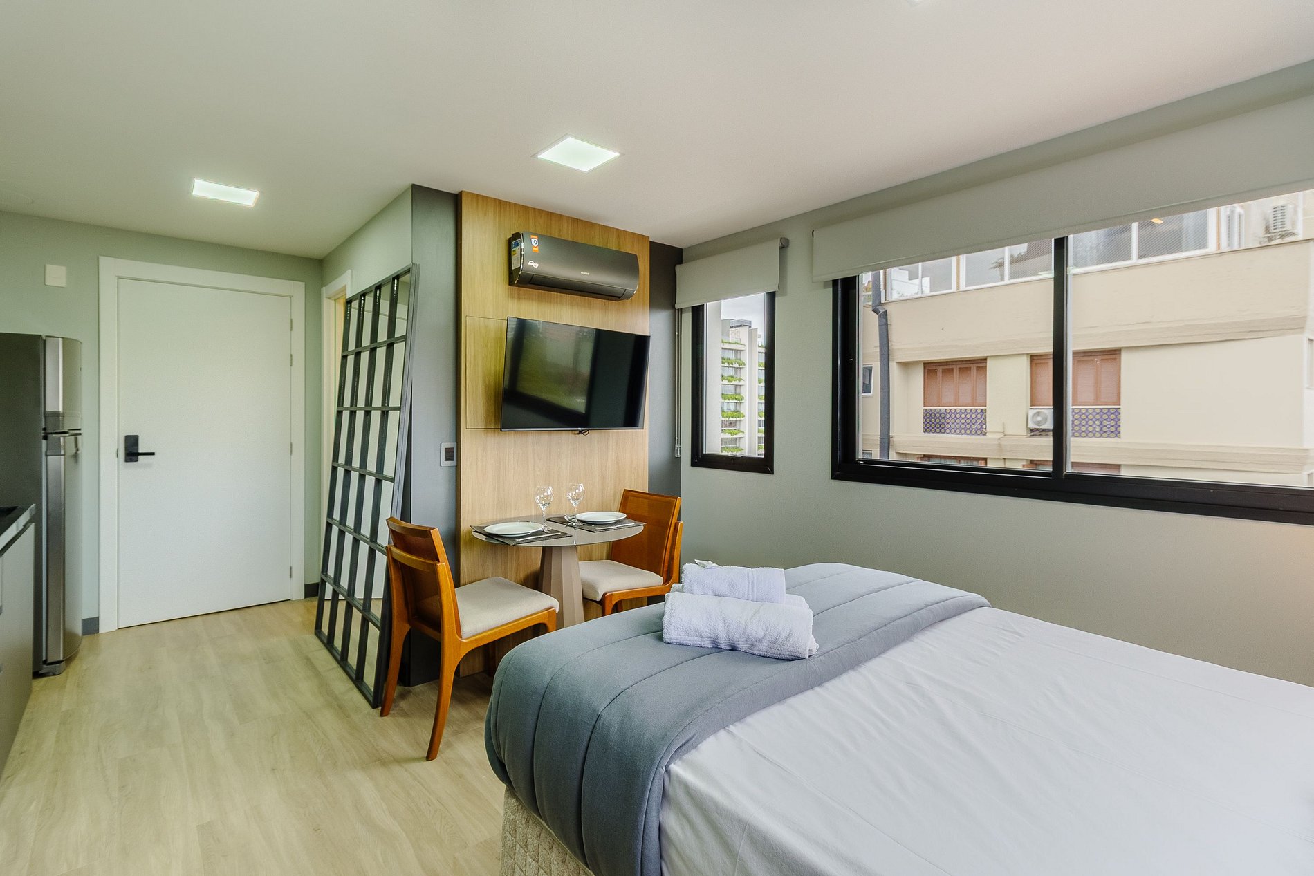 Estructura y comodidades: - Piscina infinita con vista panorámica; - Gimnasio y coworking en el edificio; - Recepción 24 horas con control de acceso facial; - Cocina completa y menaje de alta calidad; - Wi-Fi rápido y Smart TV con aplicaciones; - Se admiten mascotas; - Lavandería compartida con lavadoras y secadoras