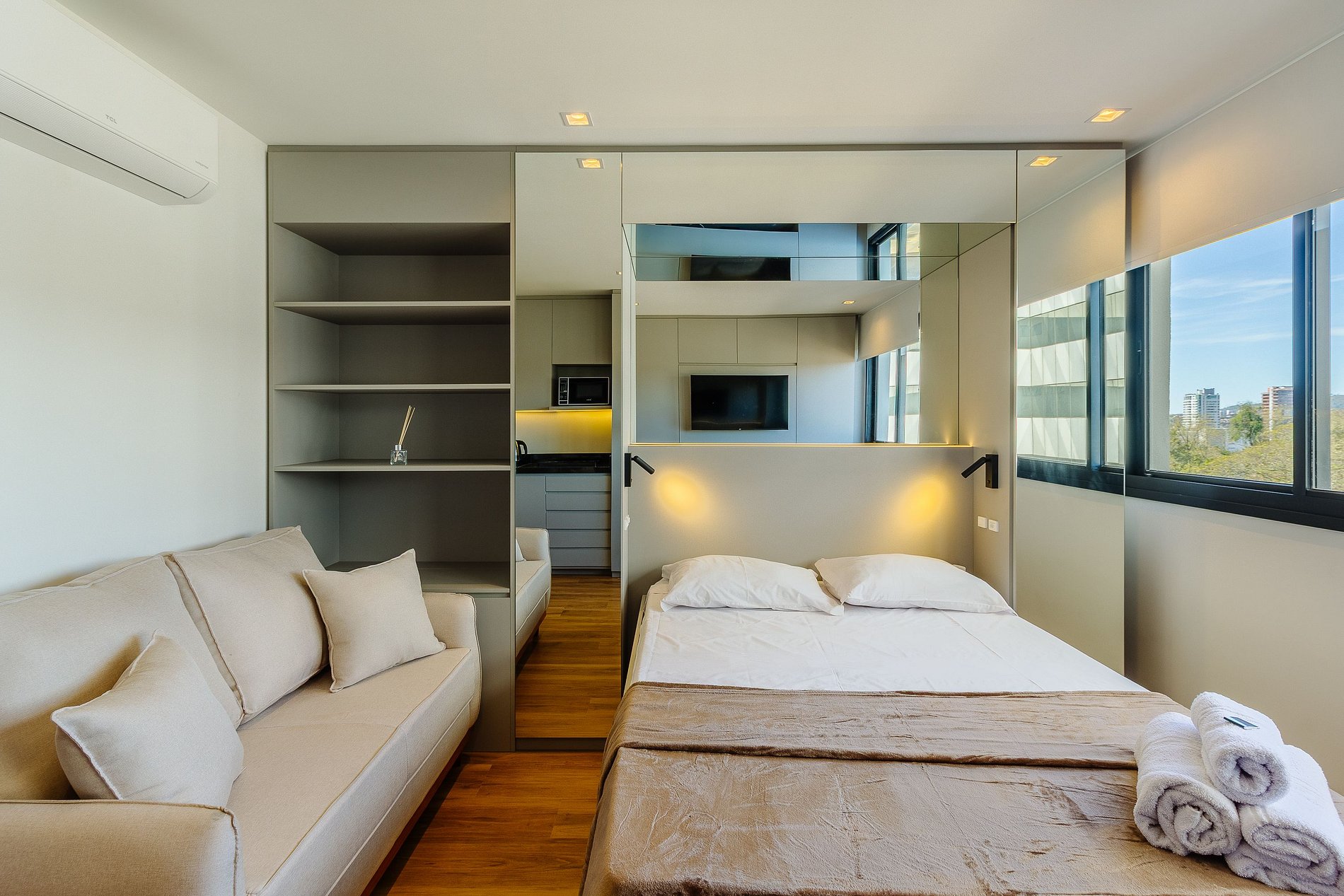 - Piscina infinita con vista panorámica; - Gimnasio y coworking en el edificio; - Recepción 24 horas con control de acceso facial; - Cocina completa y menaje de alta calidad; - Wi-Fi rápido y Smart TV con aplicaciones; - Se admiten mascotas; - Lavandería compartida con lavadoras y secadoras