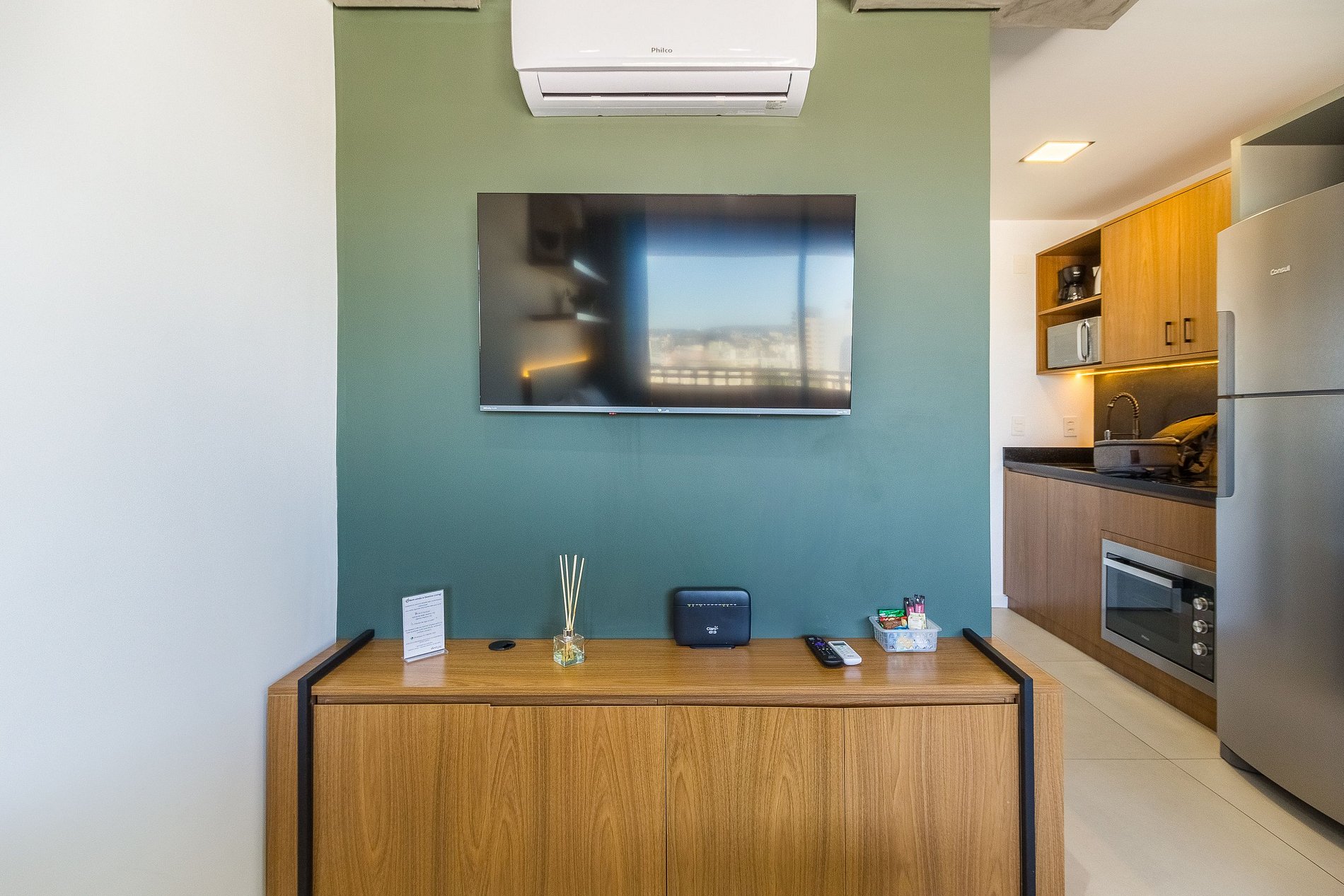 El espacio cuenta con una piscina con vistas increíbles, un gimnasio para uso de los huéspedes, ropa de cama de la mejor calidad en la habitación, lavandería de pago para lavar y secar tu ropa durante tu estancia, ¡un espacio de coworking con WiFi rápido para trabajar! El conserje está las 24 horas del día, ¡así que puedes venir tranquilo! ¡Puedes pedir iFood y recibirlo en el piso cuando veas el cine!