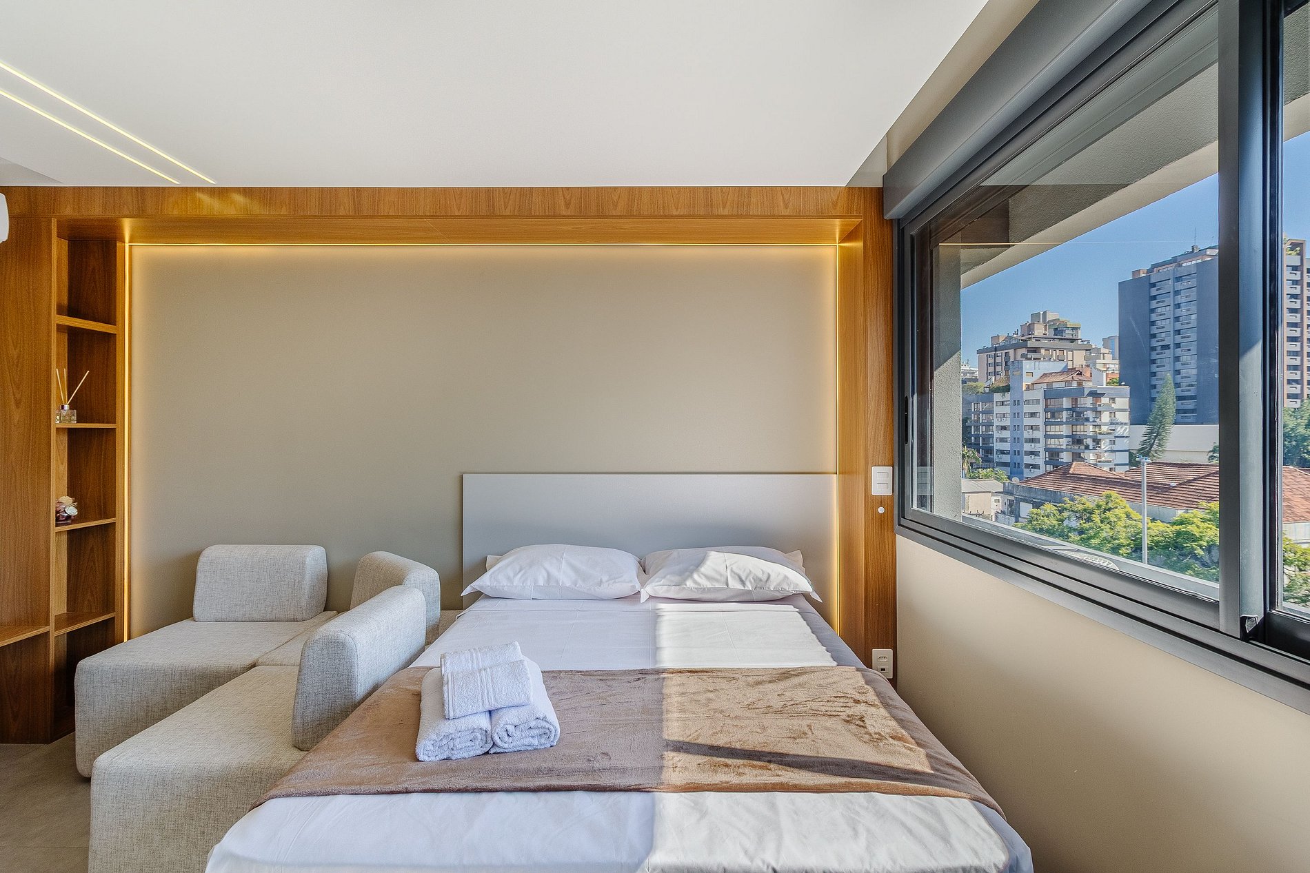 En lo alto del 13º piso, el Studio 1308 ofrece una estancia acogedora y funcional para quien busca alquilar un estudio amueblado en el barrio Rio Branco de Porto Alegre, cerca del Hospital de Clínicas y del Aeropuerto Internacional Salgado Filho, garantizando practicidad para su rutina y desplazamientos. Un estudio con decoración contemporánea, habitaciones bien equipadas y una ubicación privilegiada, es perfecto tanto para viajes de ocio como para oficinas en casa con una estructura completa.