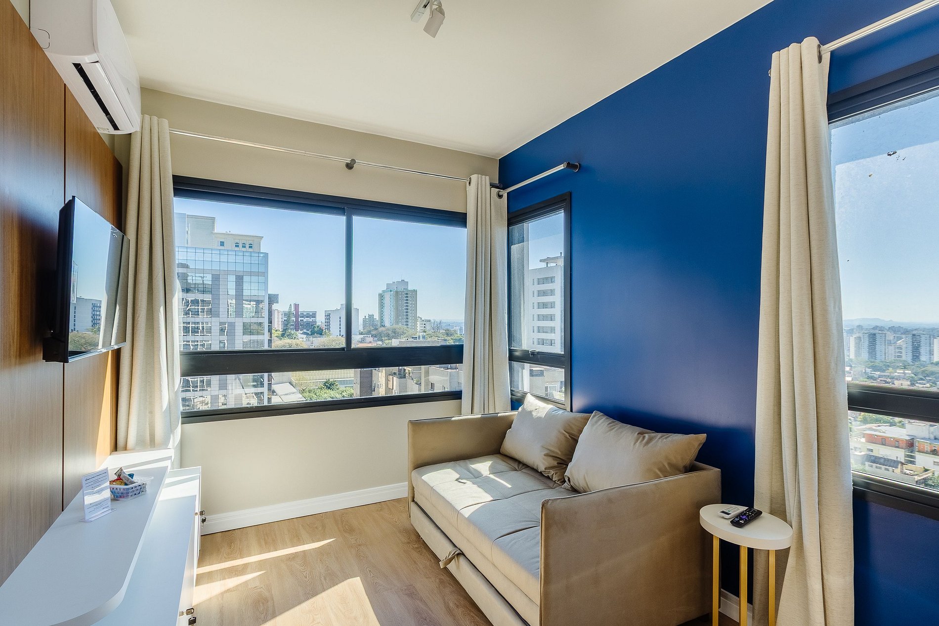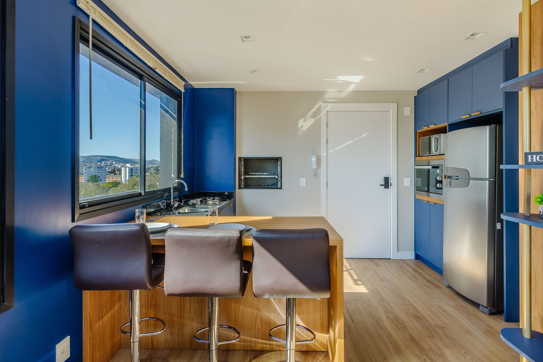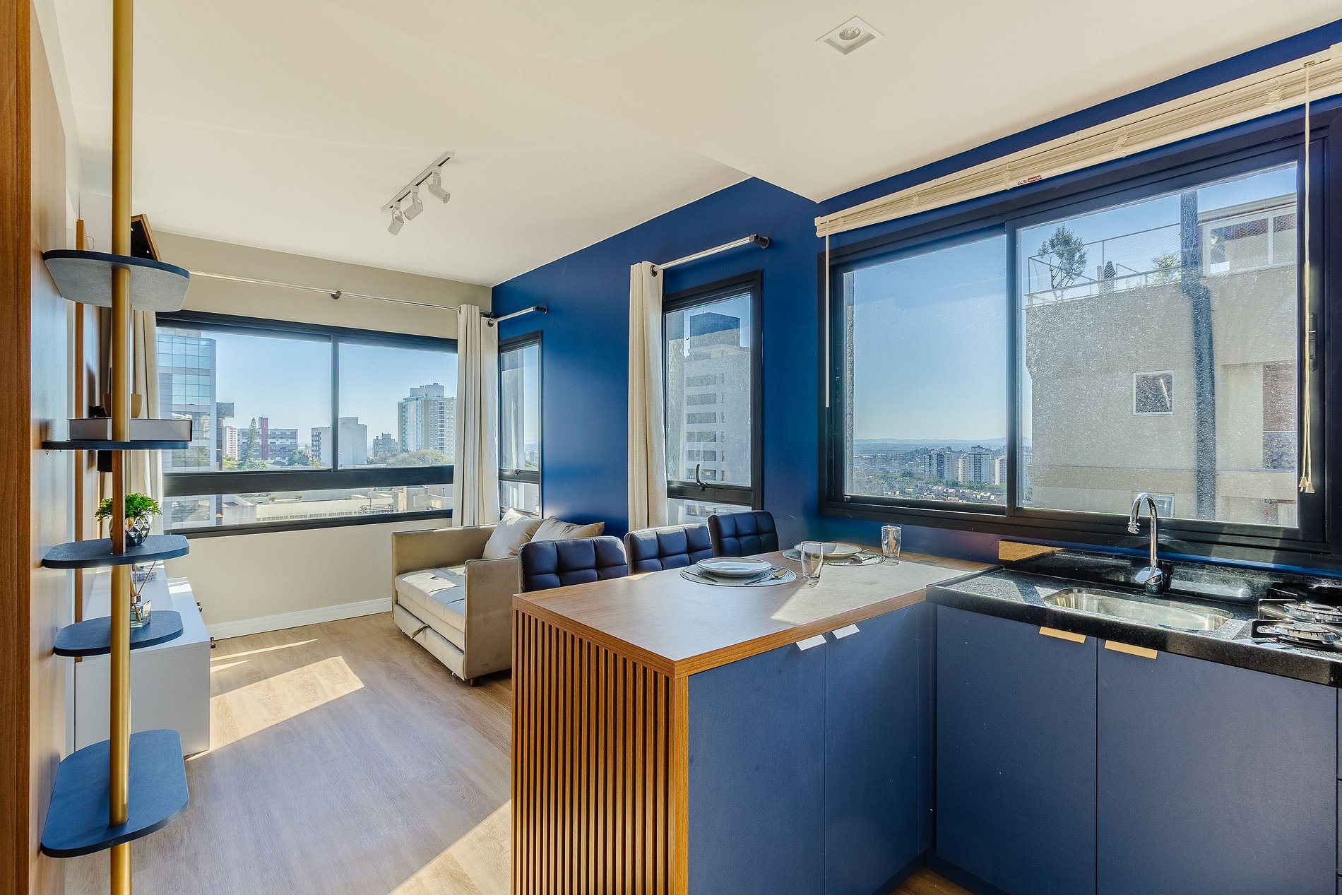 Lo más destacado de este apartamento es el acceso a la piscina infinita con impresionantes vistas de la ciudad, además de un gimnasio equipado, un espacio de coworking con internet rápido y conserje las 24 horas. Perfecto para quienes buscan un alojamiento cerca de los mejores lugares de Porto Alegre, con una infraestructura similar a la de un hotel, pero con la libertad de un hogar.