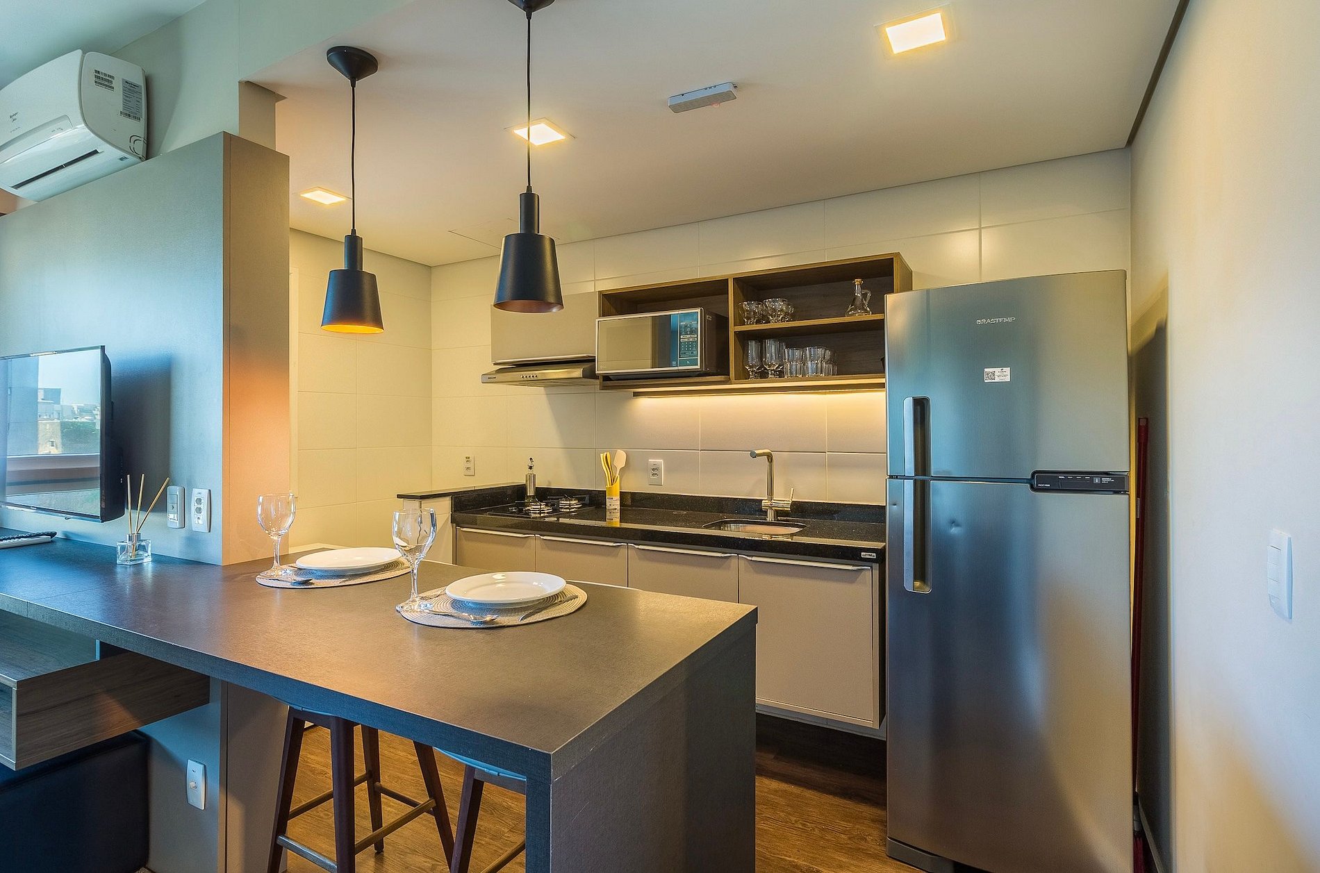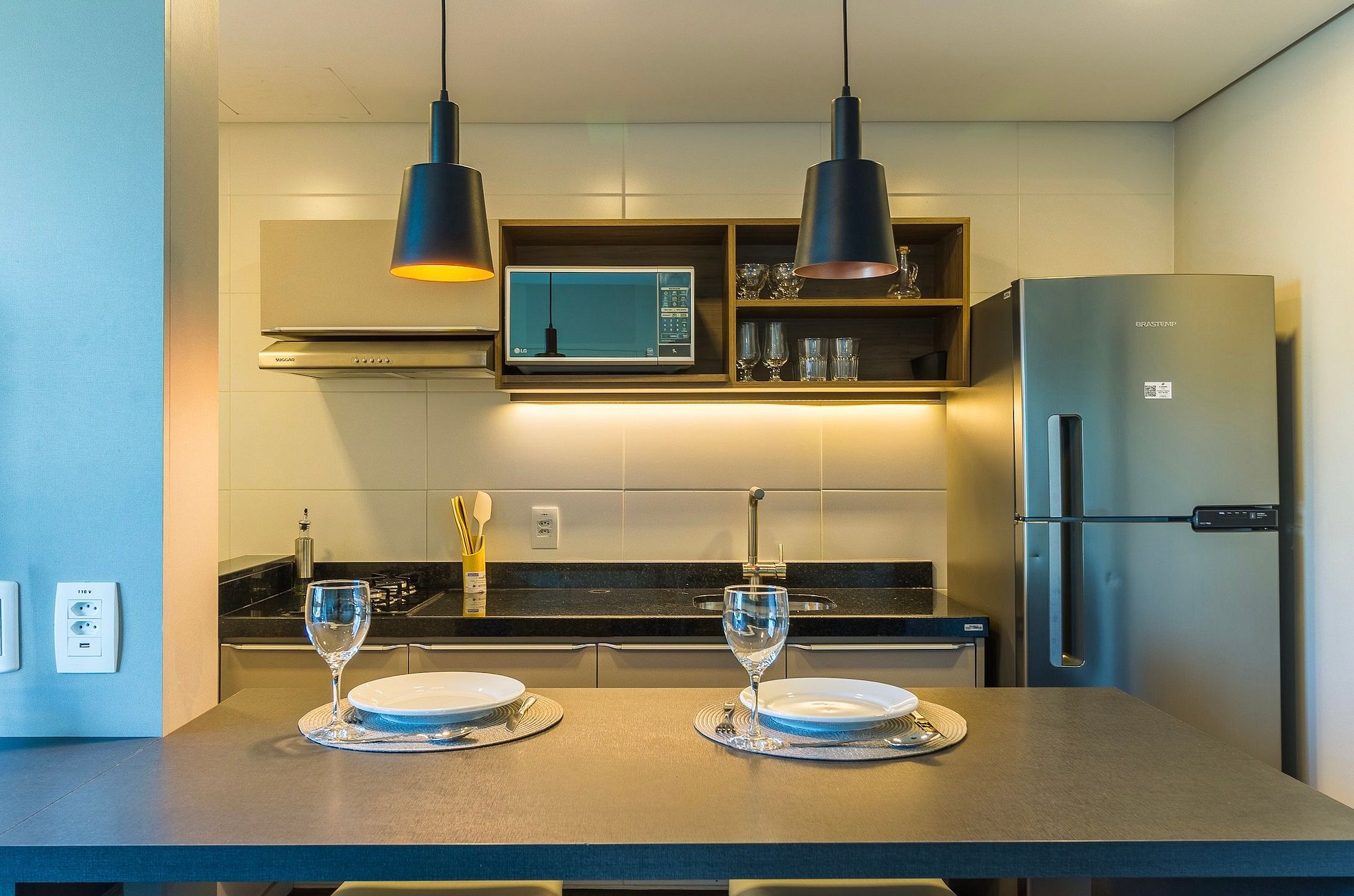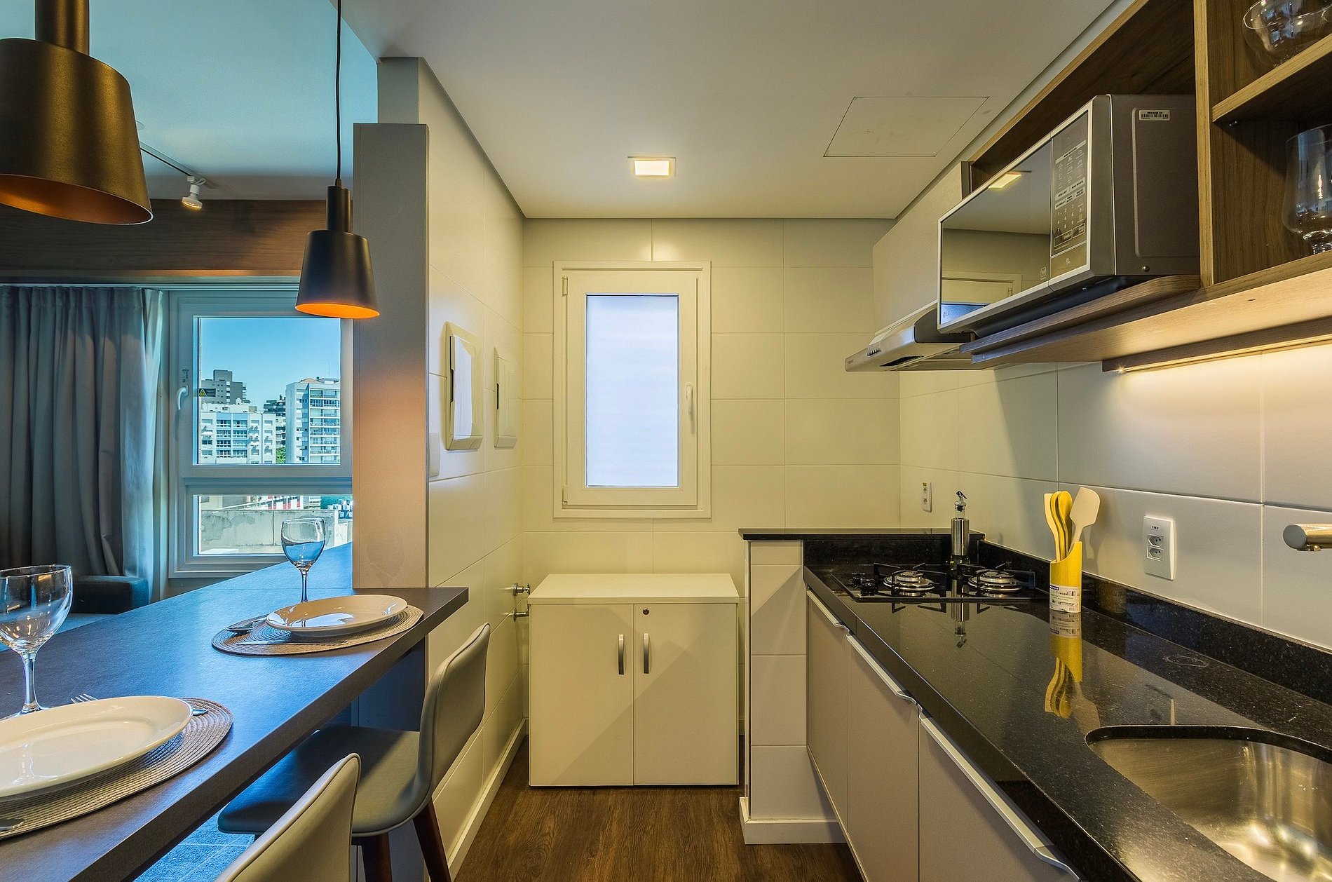 A cozinha americana é totalmente equipada, com utensílios, aparelho de jantar e eletrodomésticos essenciais, perfeita para refeições rápidas, cafés da manhã ou pequenas pausas ao longo do dia, com total autonomia.