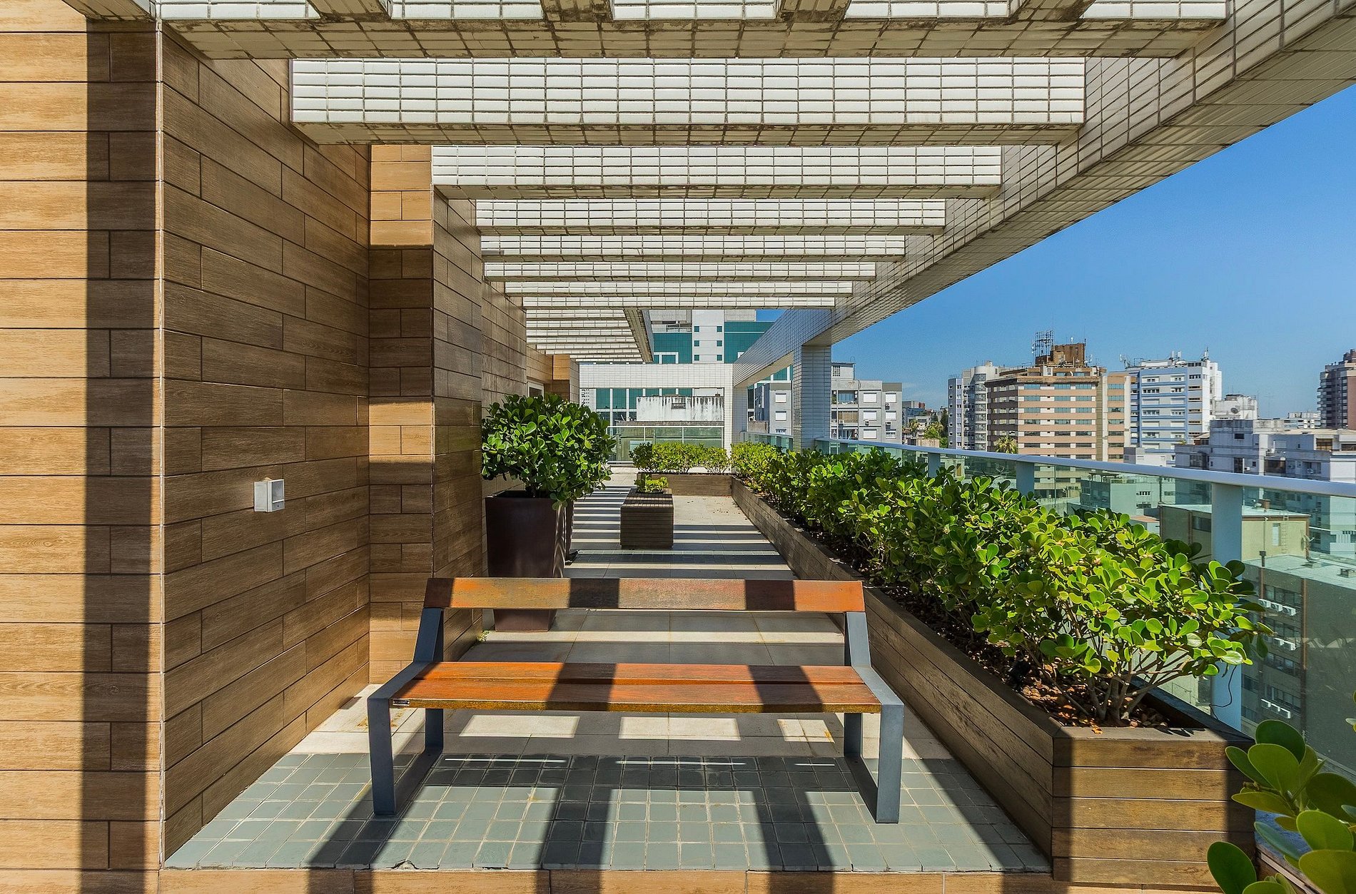 No terraço do prédio, os hóspedes têm acesso a uma academia completa, também compartilhada, além de um terraço aberto com vista privilegiada para o Parcão, um espaço perfeito para relaxar, apreciar o verde e desfrutar do bairro Moinhos de Vento de um ângulo único.
