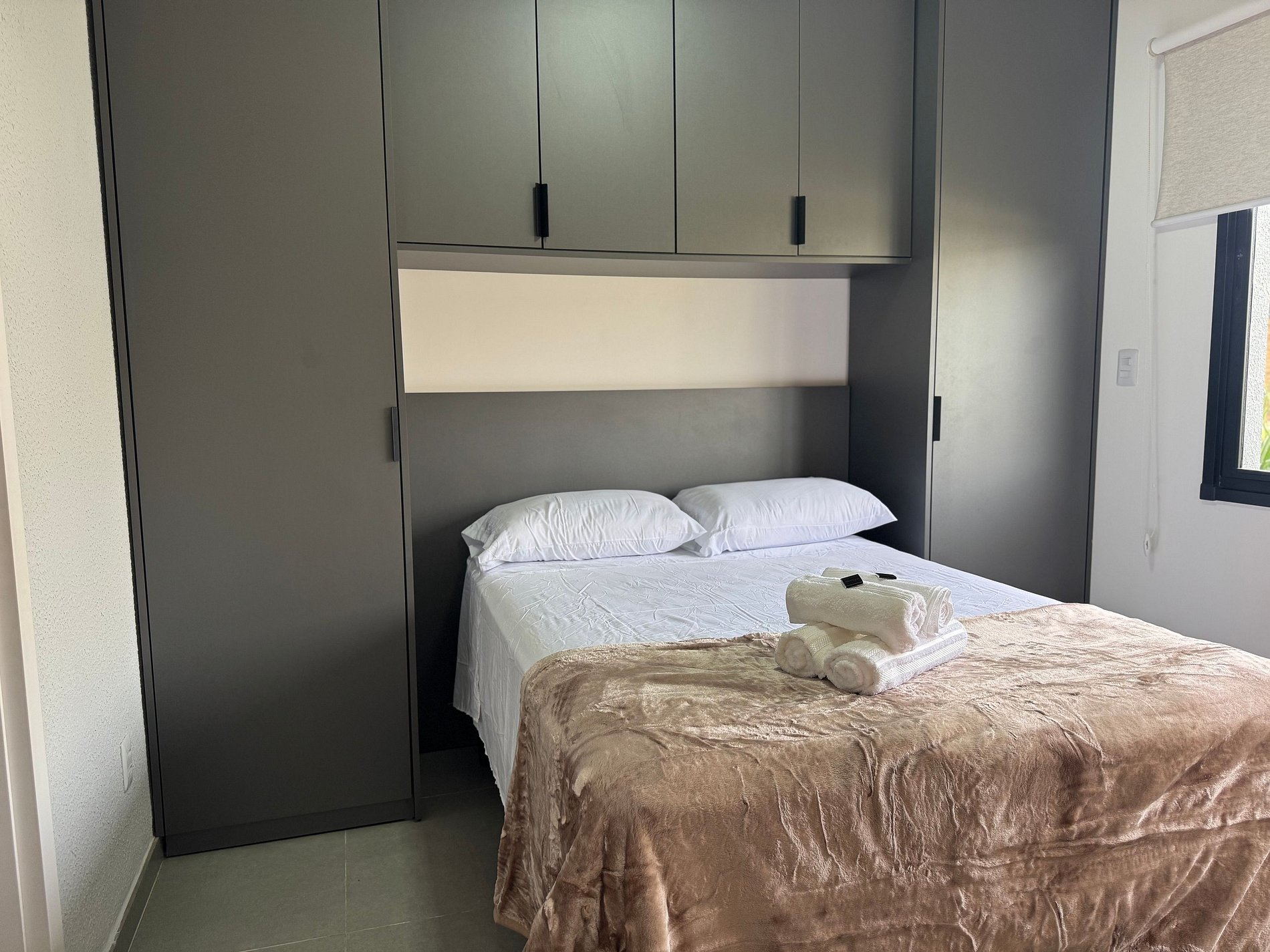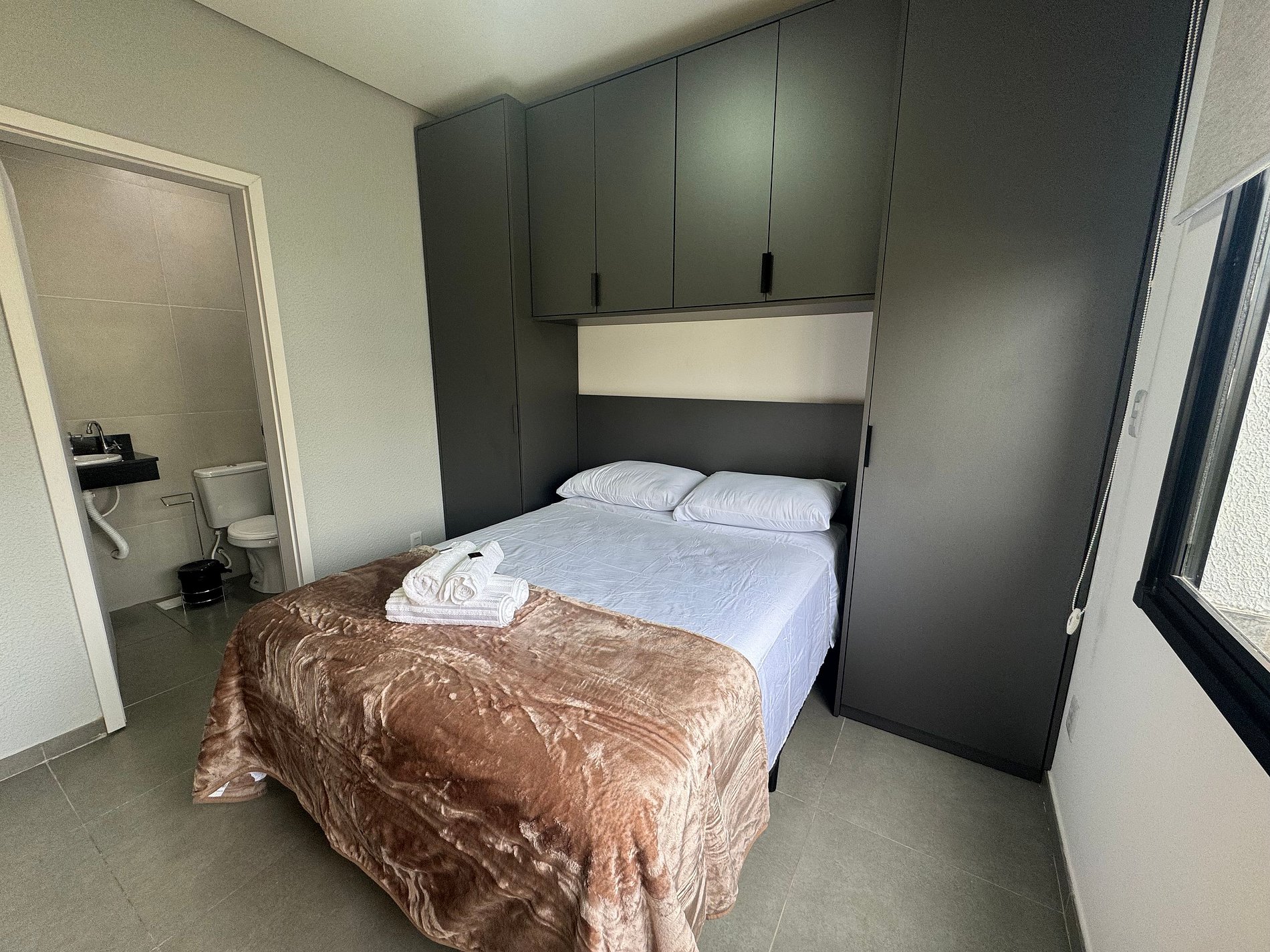 É um ambiente bem distribuído equipado com roupas de cama padrão hotelaria, garantindo conforto, higiene e uma excelente noite de sono.