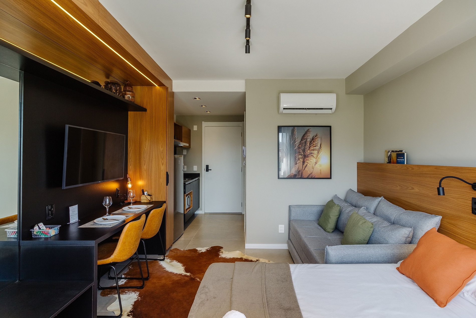 Studio mobiliado pronto para te receber com conforto e estilo! No ambiente temos uma cama ultra confortável de casal, ar-condicionado, SmartTV (Netflix, Disney+, Amazon), sofá-cama, WiFi veloz, espelho grande e ferro a vapor para você! A cozinha completa inclui panelas de qualidade, torradeira, faca e tábua de corte e cafeteira para você fazer aquele café da manhã fresquinho! O banheiro conta com água quente e chuveiro excelente!