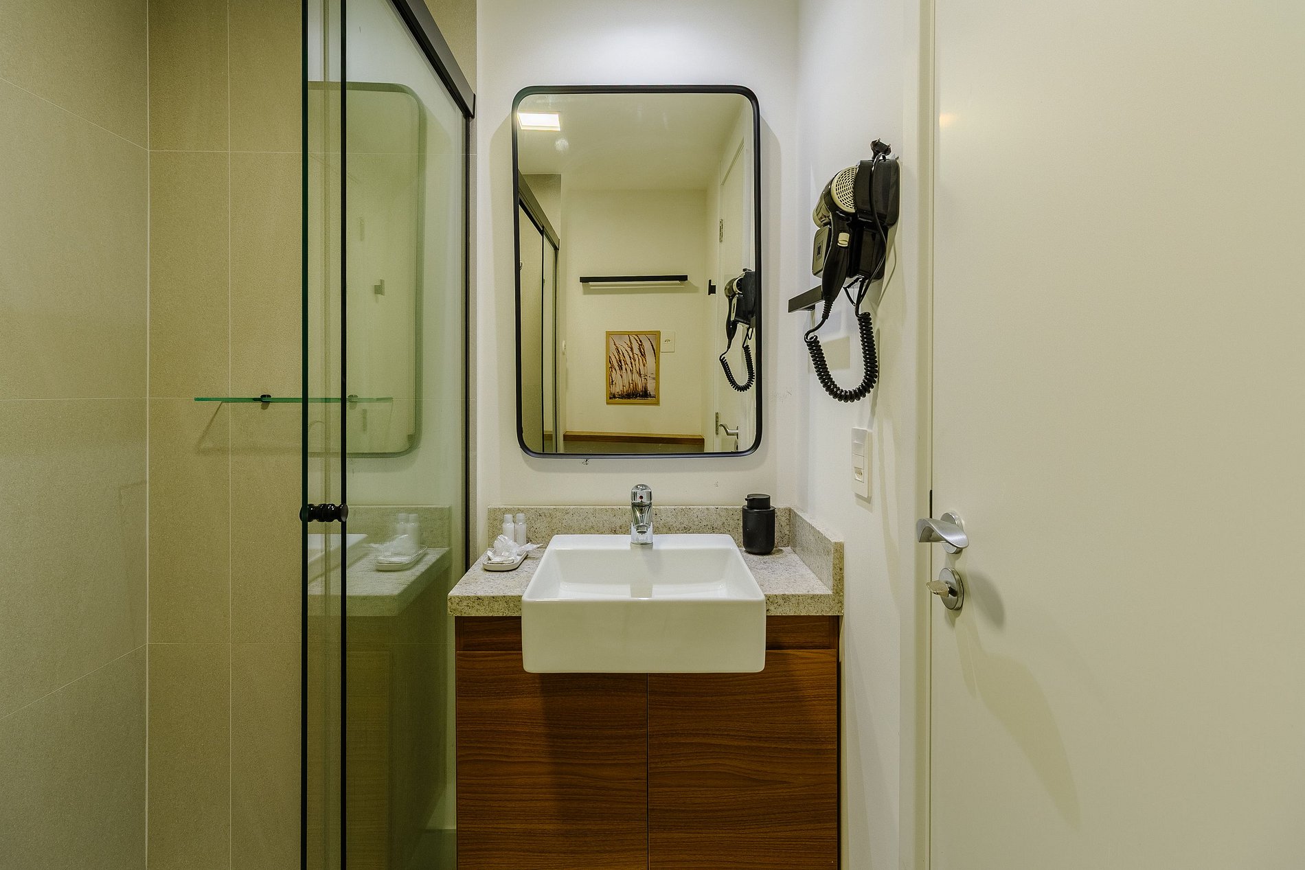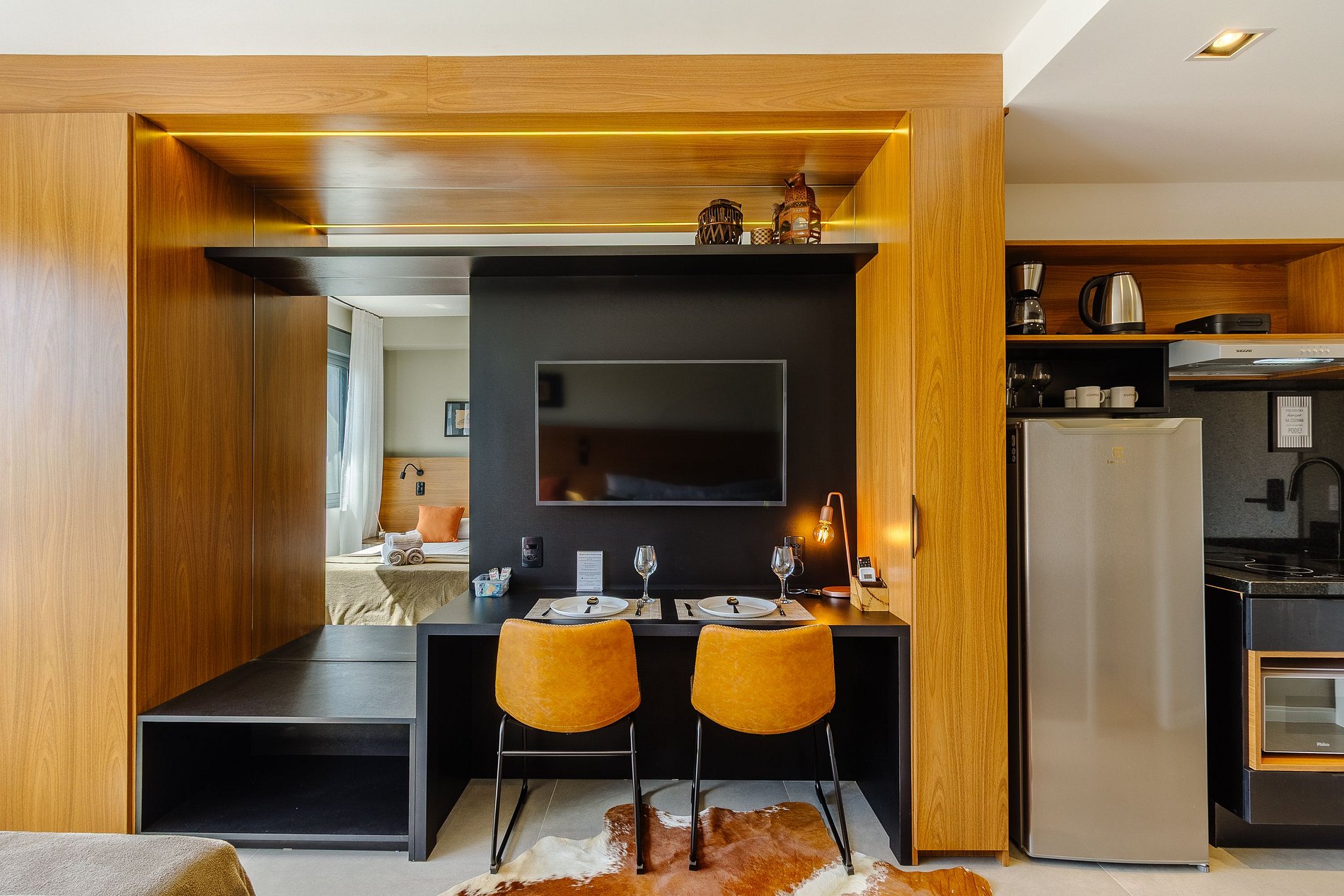 Com cerca de 27m², o espaço é mobiliado com cama de casal confortável, sofá-cama, Smart TV com streaming, Wi-Fi veloz, ar-condicionado, espelho grande e cozinha equipada com cafeteira, utensílios e micro-ondas. O banheiro moderno oferece chuveiro com água quente e ótimo fluxo. A unidade também é pet friendly, permitindo que você traga seu companheiro de quatro patas para a viagem.