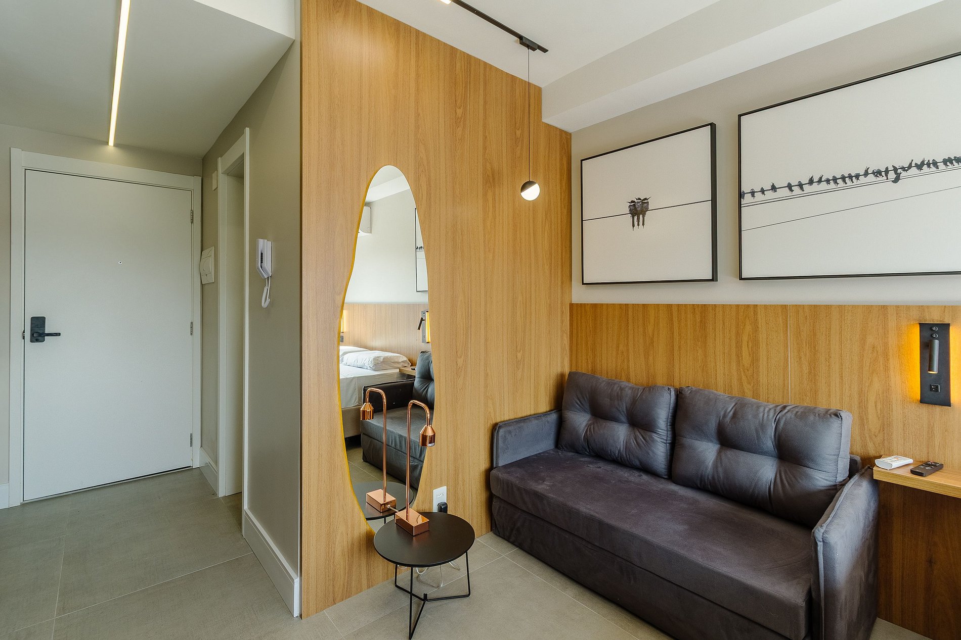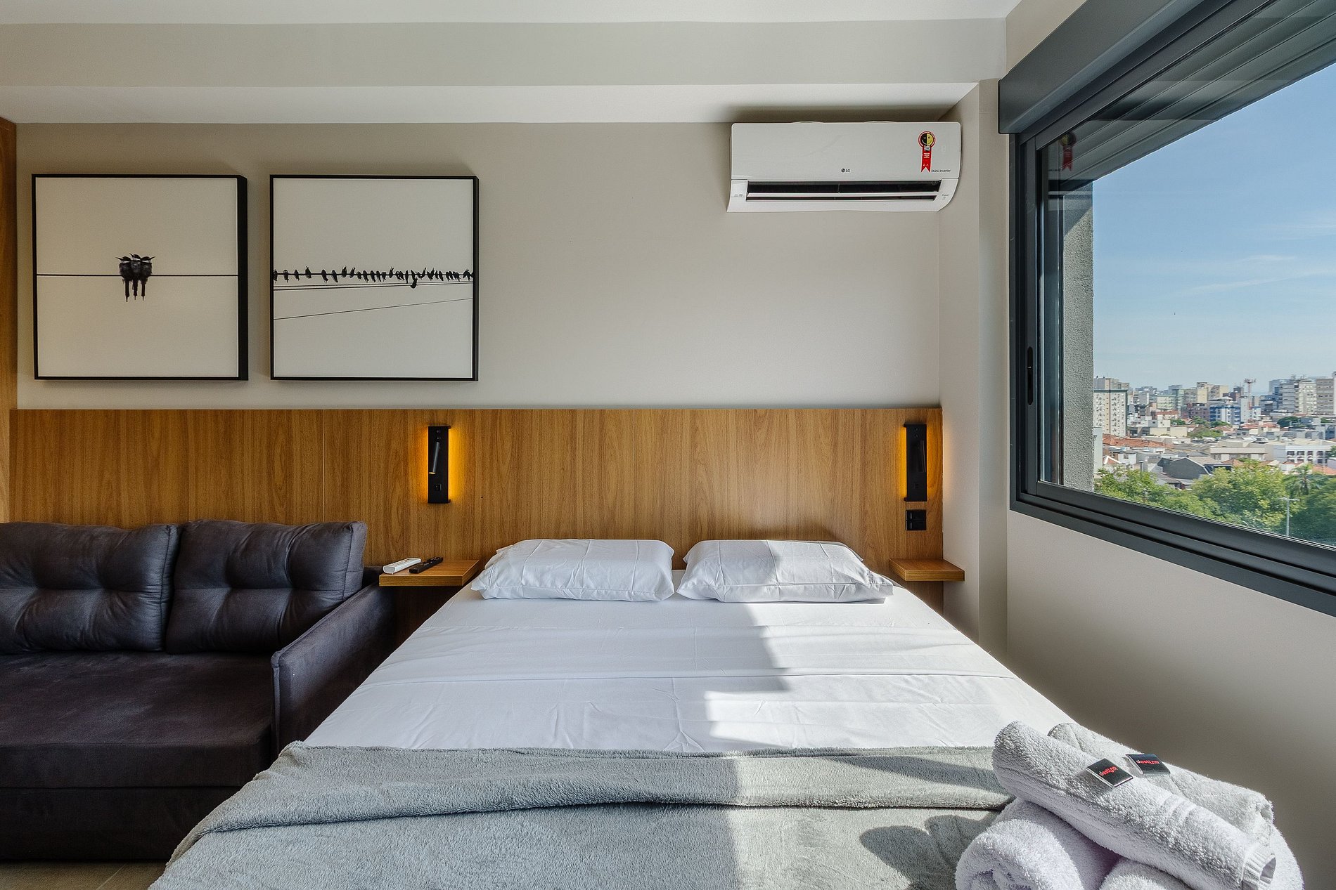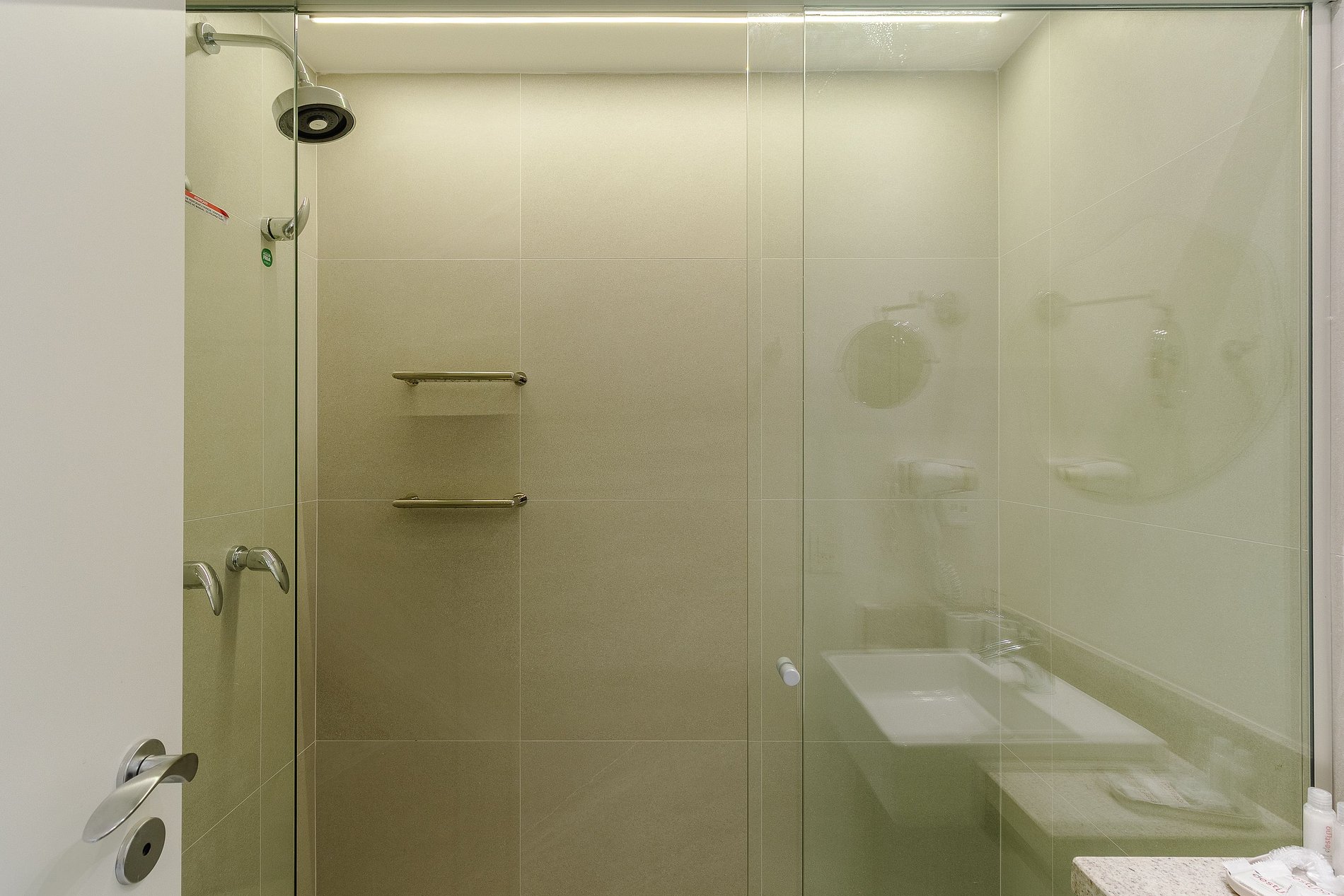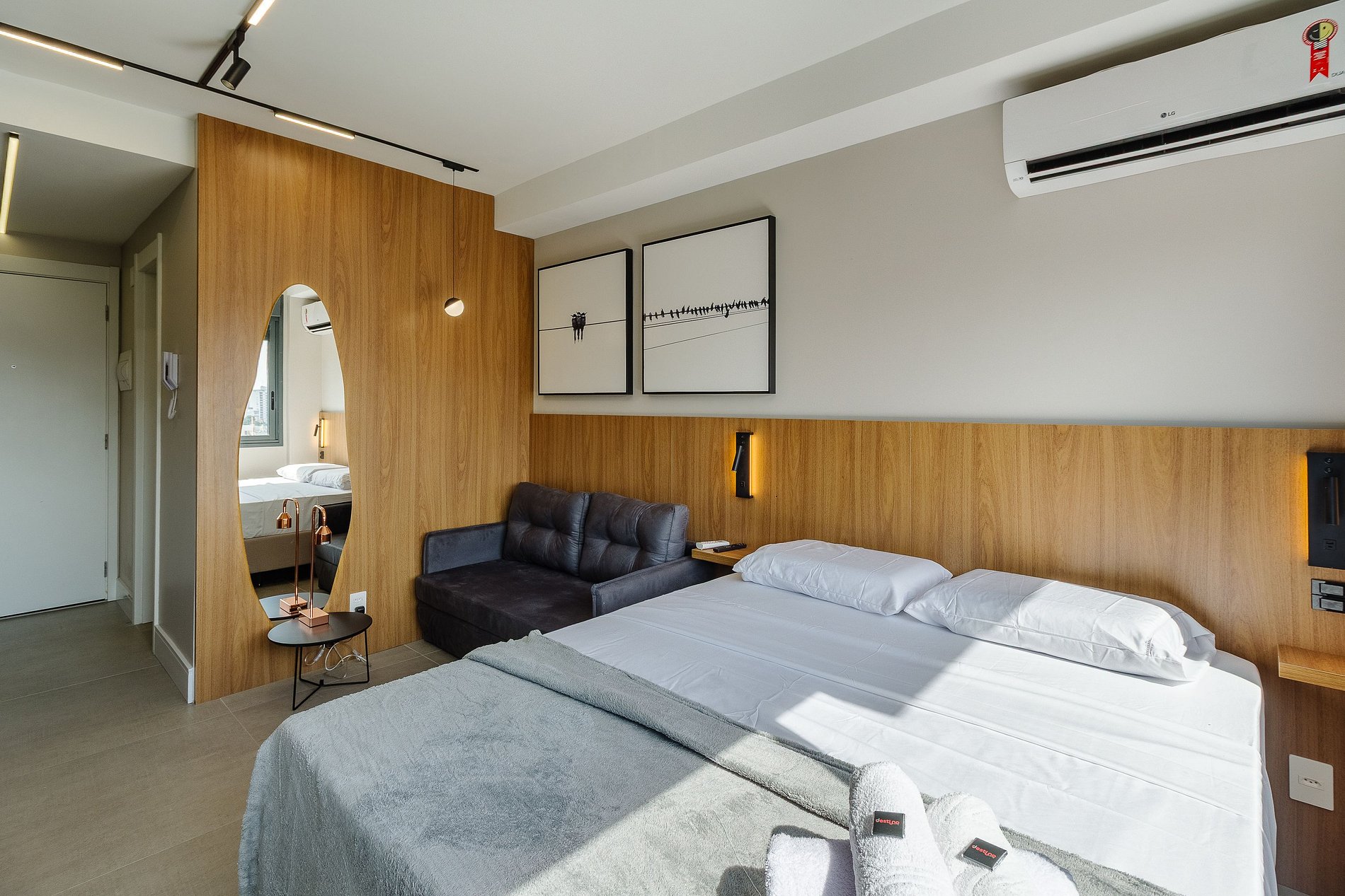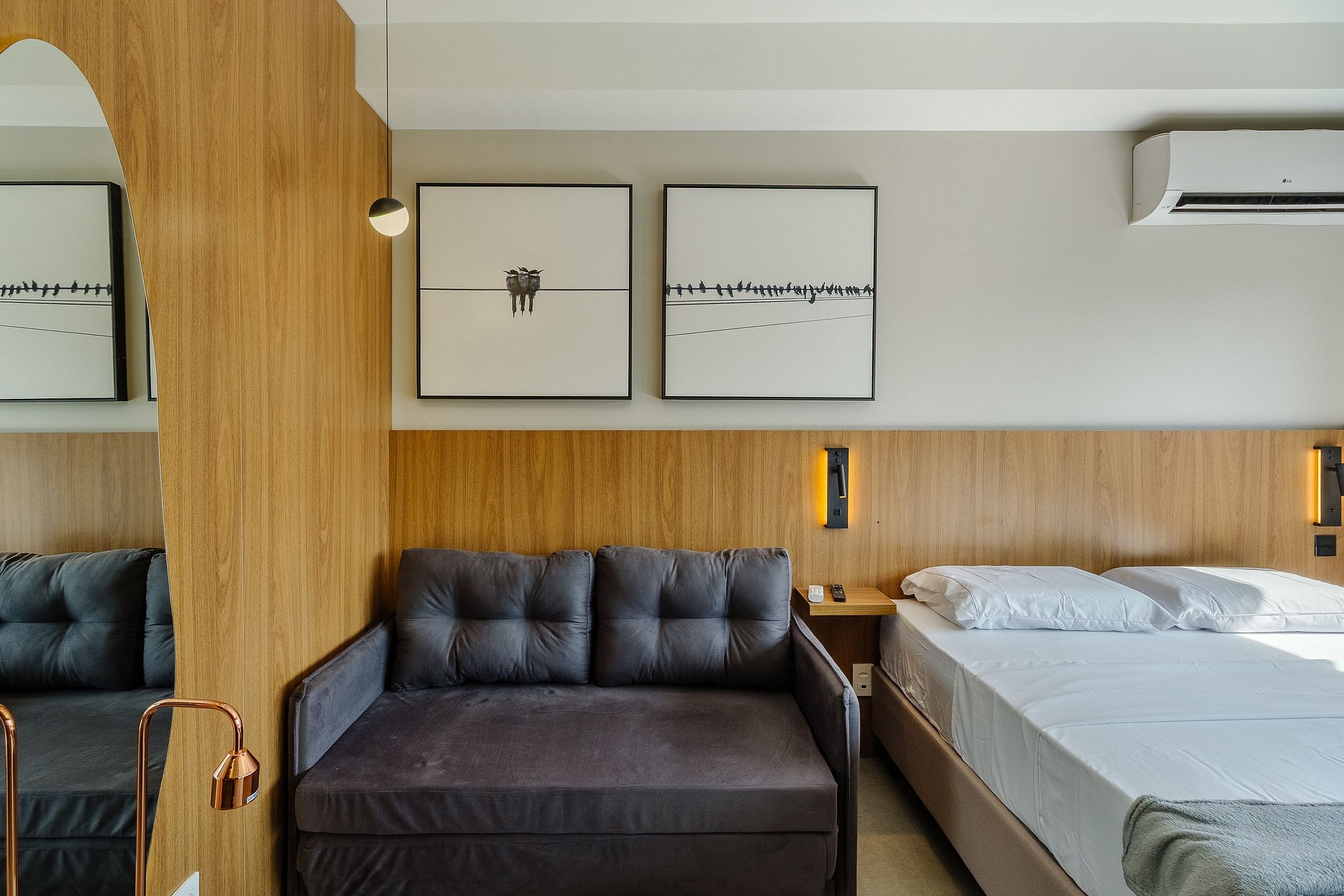 Com cerca de 27m², o espaço é mobiliado com cama de casal confortável, sofá-cama, Smart TV com streaming, Wi-Fi veloz, ar-condicionado, espelho grande e cozinha equipada com cafeteira, utensílios e micro-ondas. O banheiro moderno oferece chuveiro com água quente e ótimo fluxo. A unidade também é pet friendly, permitindo que você traga seu companheiro de quatro patas para a viagem.