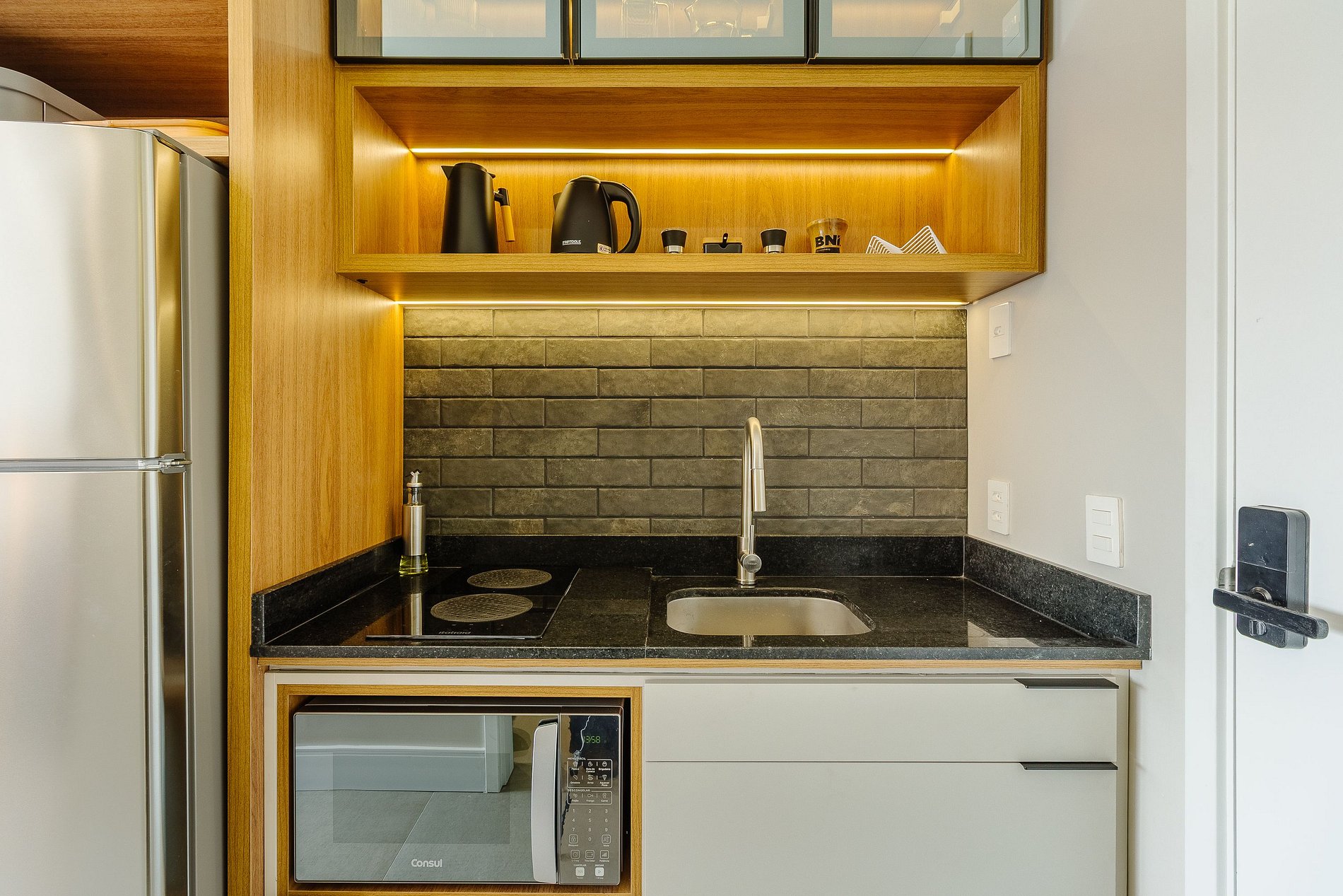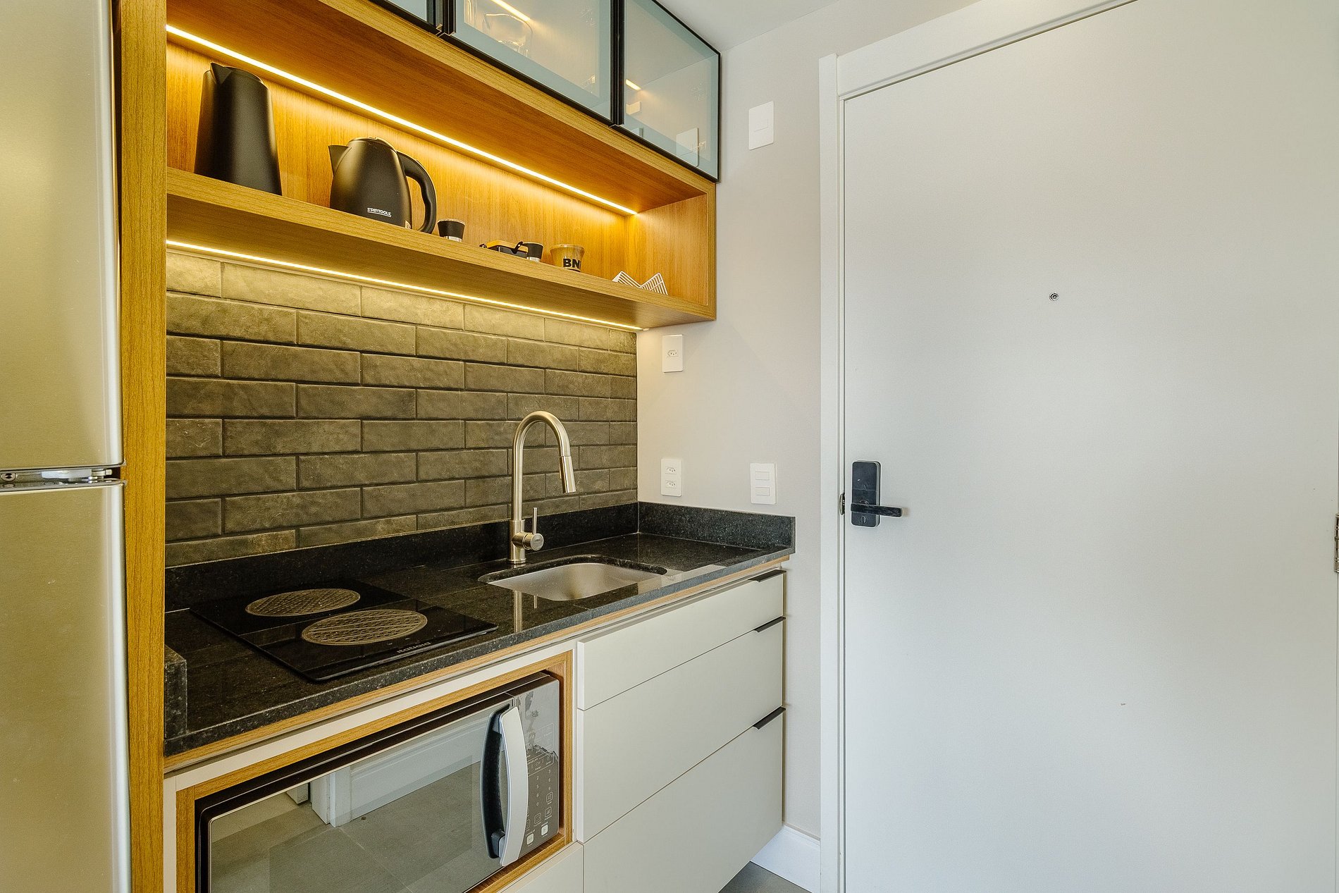 A estrutura do edifício inclui piscina de borda infinita com vista, academia completa, coworking com internet rápida, lavanderia compartilhada e portaria presencial 24h com acesso por reconhecimento facial. O apartamento tem fechadura digital, garantindo autonomia e segurança no check-in.
